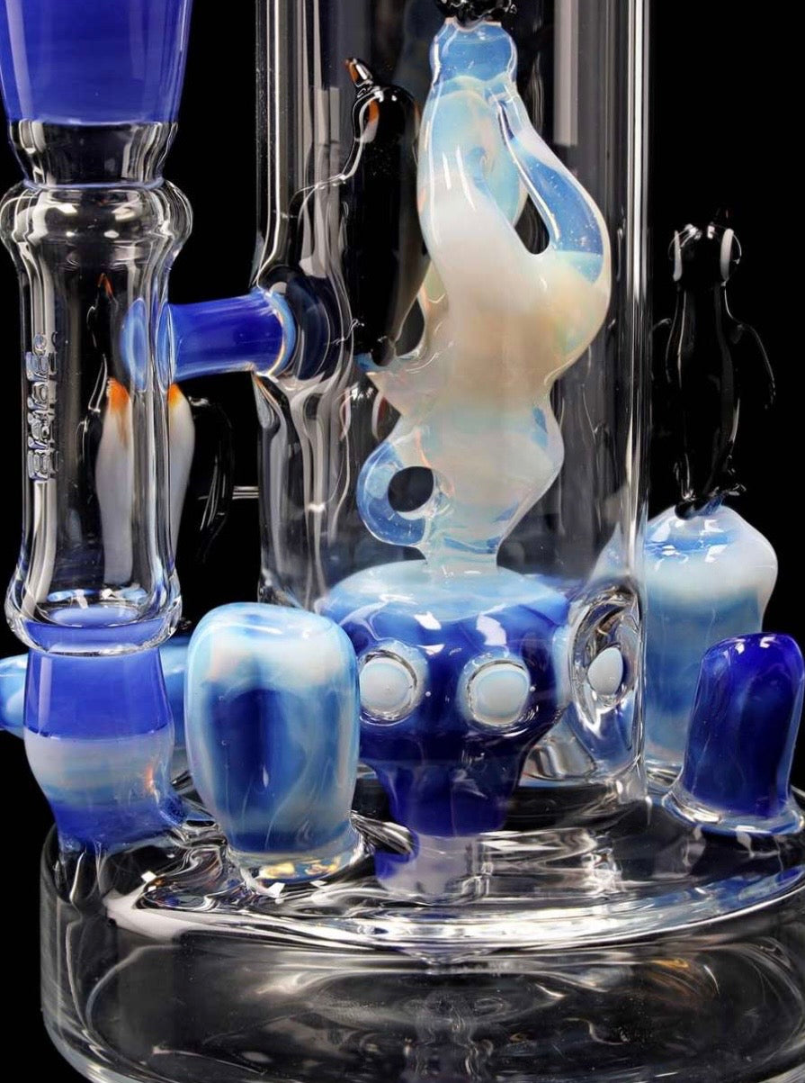 Der Eisberg samt der zwei Pinguine im Inneren der Bong wirkt wie ein Perkolator und bringt Luft und Wasser heftigst zum Rotieren. Dadurch wird der Rauch gut runtergekühlt und gefiltert. Die Verlängerung des Rauchweges durch die Pinguin-Rutsche hat ebenfalls eine rauchkühlende Wirkung.